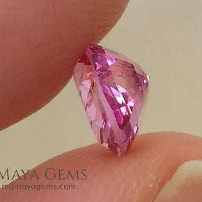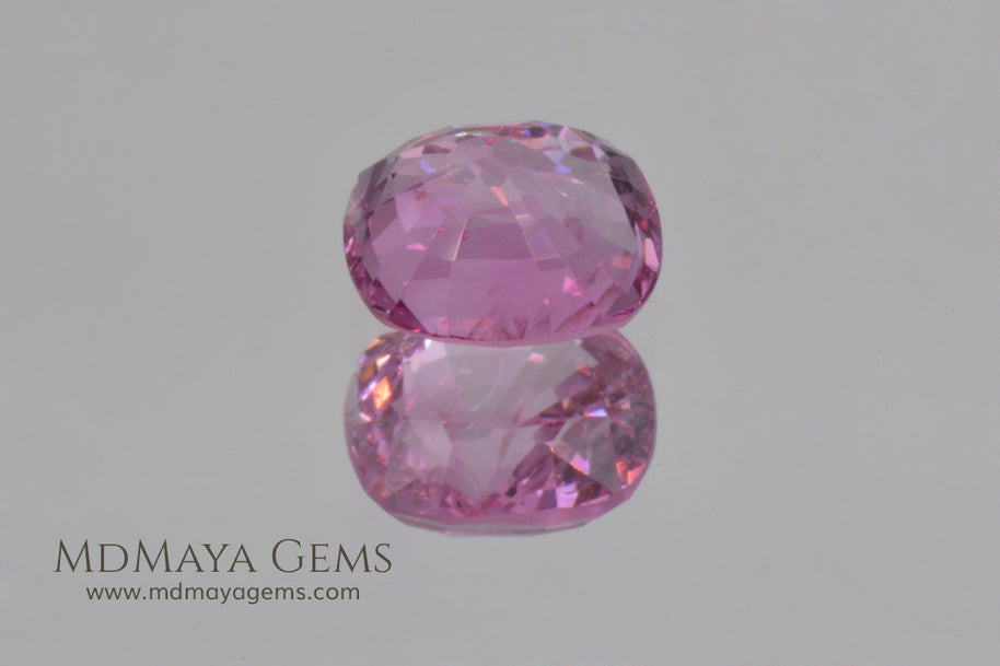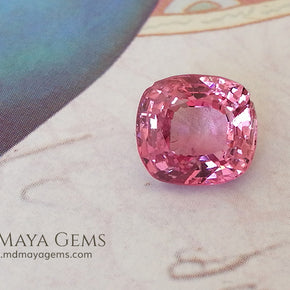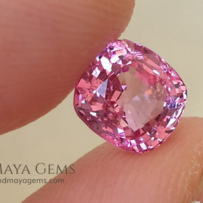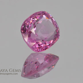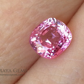Bright and bold pink spinel from Mogok, Burma. A lively 1.40 ct cushion cut with vibrant luster and saturated color. Minor flaws bring great value.