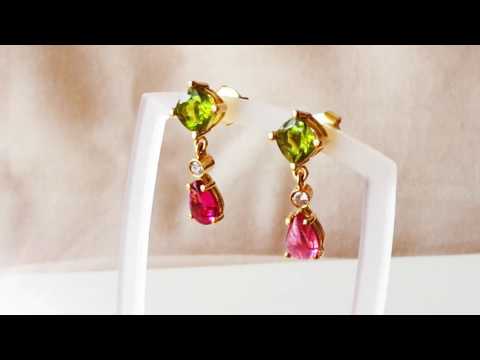 Glamorous and Elegant Earrings in 18 k. yellow gold with Peridots, Rubellite Tourmalines and Diamonds. A little luxury to indulge your senses.