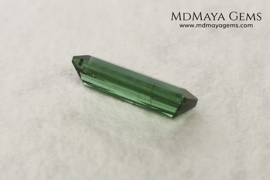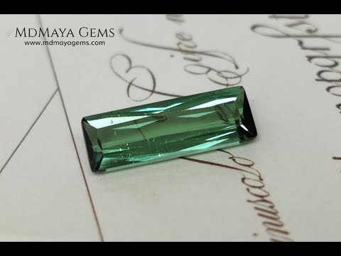 Elongated 1.71 ct tourmaline with vivid neon green-blue tones. A luminous gem with great value and elegant proportions.