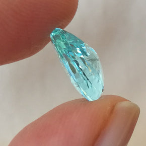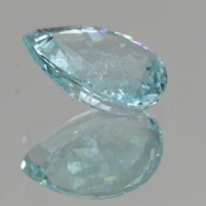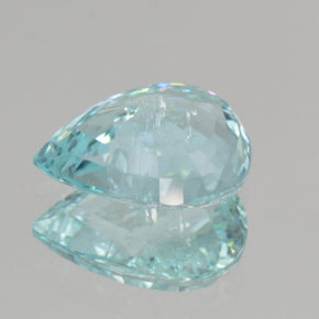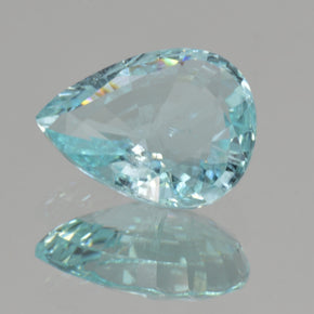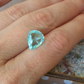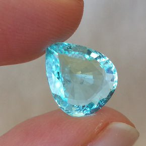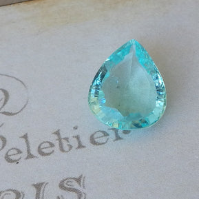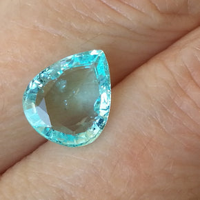 Bright neon greenish-blue Paraiba tourmaline, pear cut, copper-bearing, with strong color and impressive size. Heated, moderate clarity—great visual impact.