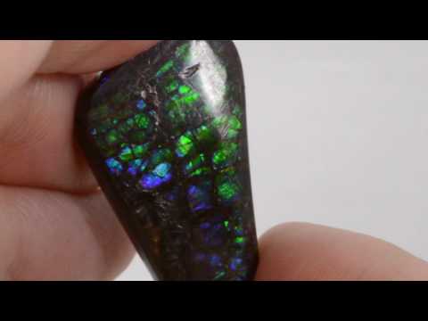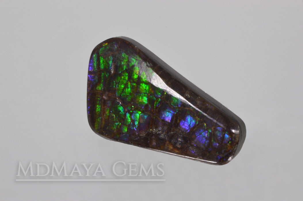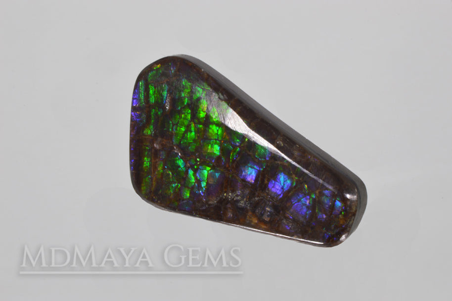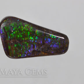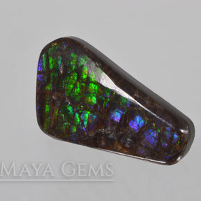 29.31 ct Canadian ammolite with bright green and blue iridescence. Freeform cabochon, ideal for jewelry lovers seeking a natural multicolor gem.