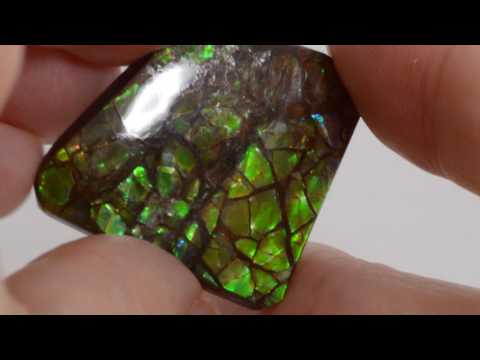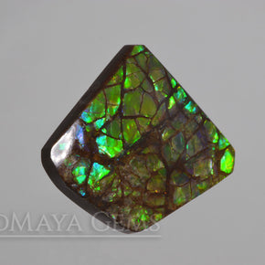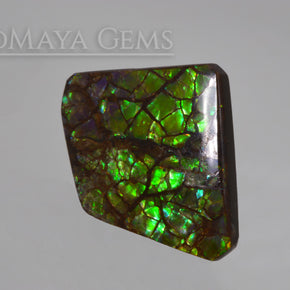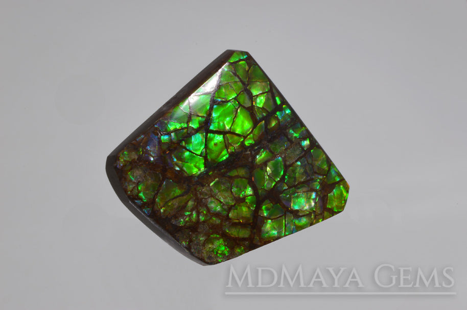28.24 ct green Canadian ammolite cabochon with bright iridescence and elegant rhomboid shape. A fine choice for custom jewelry creations.