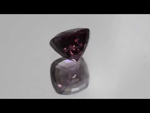 This large cushion-cut purple spinel draws the eye with its rich reddish hue, softened by a subtle grayish veil that adds character and depth. In daylight, its reddish-purple body color appears slightly muted, while under incandescent light it awakens with a vibrant inner glow.