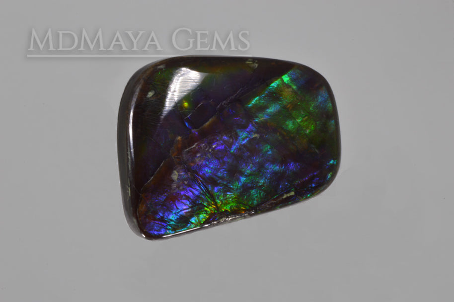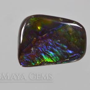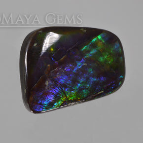 This 15.05 carat natural ammolite from Canada presents a unique freeform cabochon with a soft trapezoidal shape and rounded edges. Measuring 21.22 x 16.59 x 3.84 mm, the gem displays a captivating interplay of blue, green, and yellow tones, with vibrant iridescence emerging under the light. The darker, moody palette gives it a sophisticated, almost mysterious presence—perfect for bold, custom jewelry designs that embrace individuality and depth. Its organic textures and surface movement evoke the prehistoric origins of this rare fossil-based gem, adding both visual and symbolic richness to any collection.