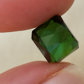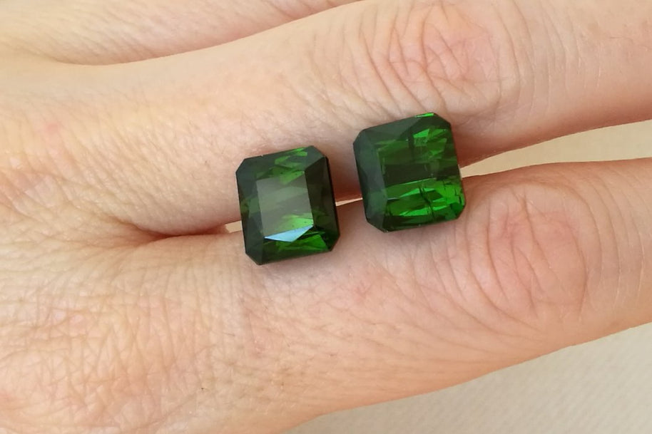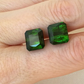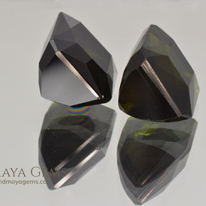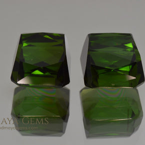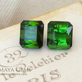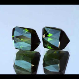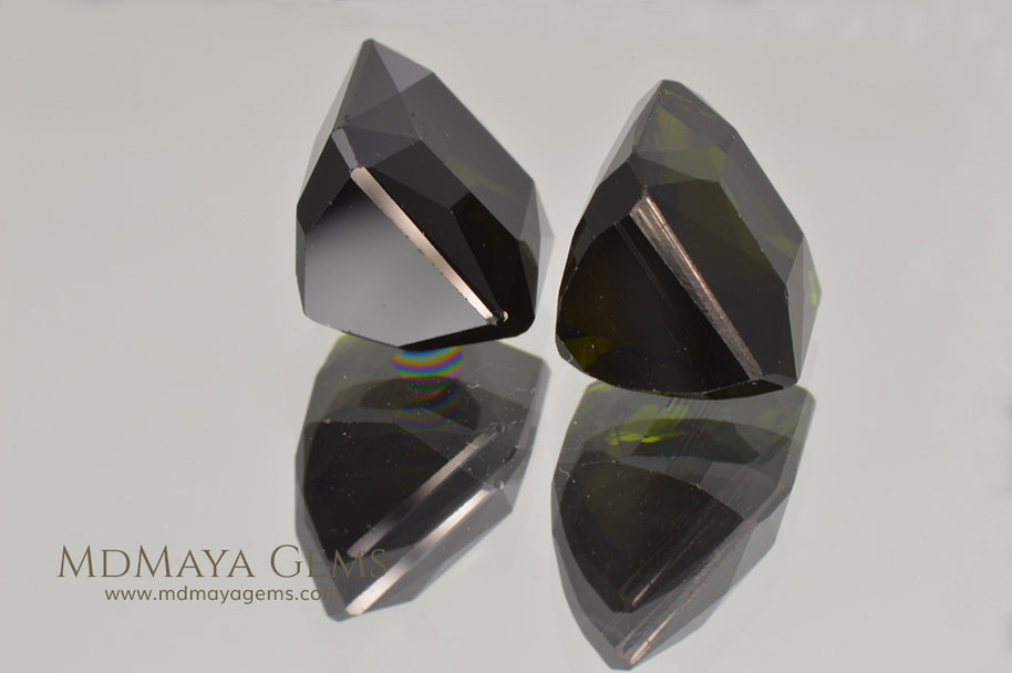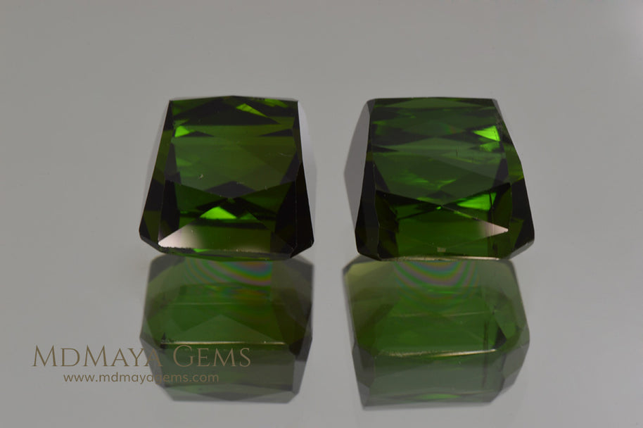 This matched pair of dark green tourmalines totals 12.74 ct, featuring slightly yellowish-green hues with vivid depth and excellent brilliance. Their fancy cut and strong saturation make them ideal for high-end custom jewelry, from elegant drop earrings to mirrored designs.