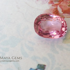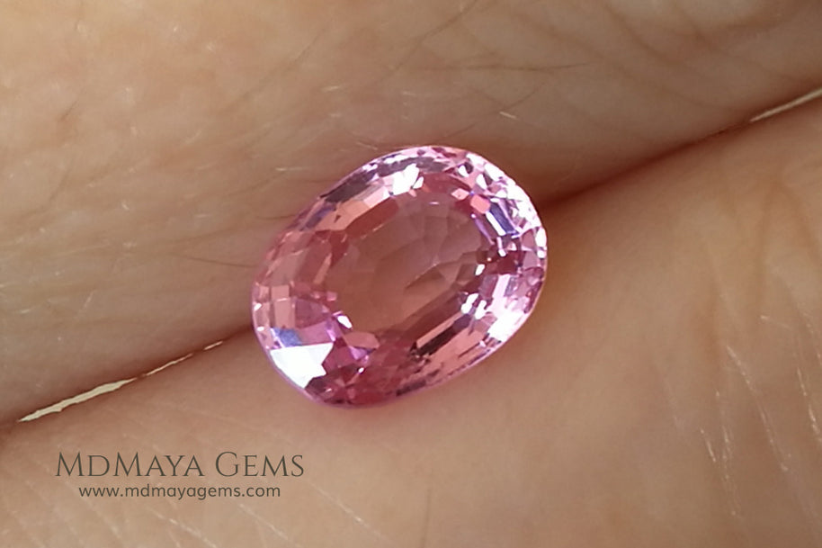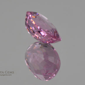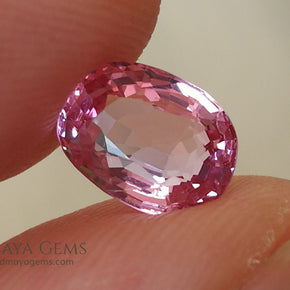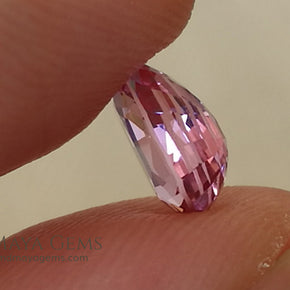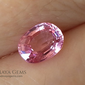 This vibrant 1.71 ct natural pink spinel from Burma displays a delicate, slightly purplish-red hue (slpR) with a very light tone and soft saturation. Its oval cut enhances the brilliance of the gem, revealing excellent internal clarity with only a minor nick in the girdle—visible solely under magnification.