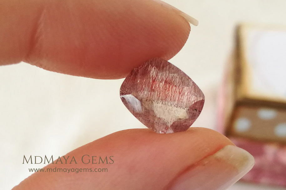 Rare and vibrant Strawberry Quartz with hematite inclusions. Unique cushion cut gem—ideal for bold, artistic jewelry designs.