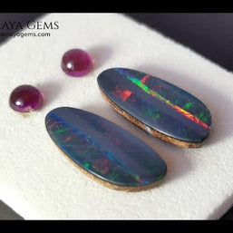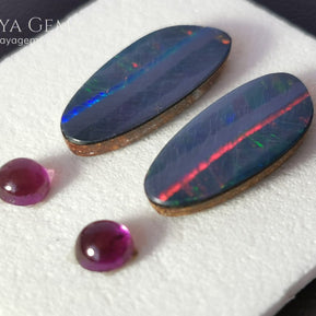 Complementing the opals are two rare Umbalite garnets—a prized purple garnet variety from the Rhodolite group. With rich color and exceptional clarity, these gems enhance the visual harmony of the set, offering a striking contrast to the opals’ fire.