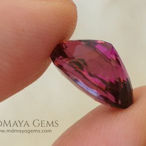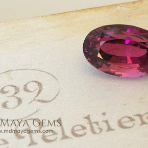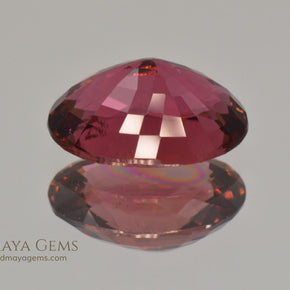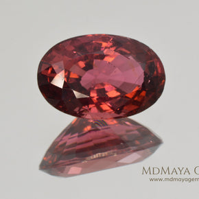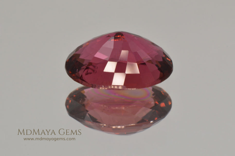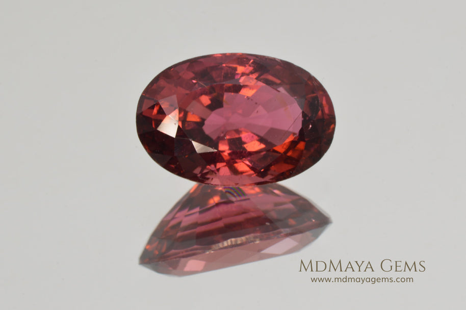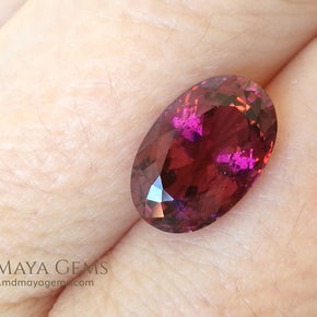 This 4.04 ct rubellite tourmaline from Mozambique features an elegant oval cut with good brilliance and a pleasing elongated shape. With a strongly purplish-red color (30 stpR), medium-light tone (4), and strong saturation (5), it offers a vibrant, lively presence under natural and artificial light.