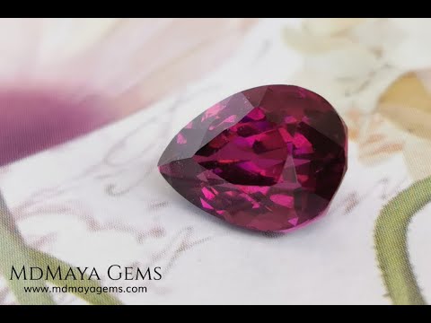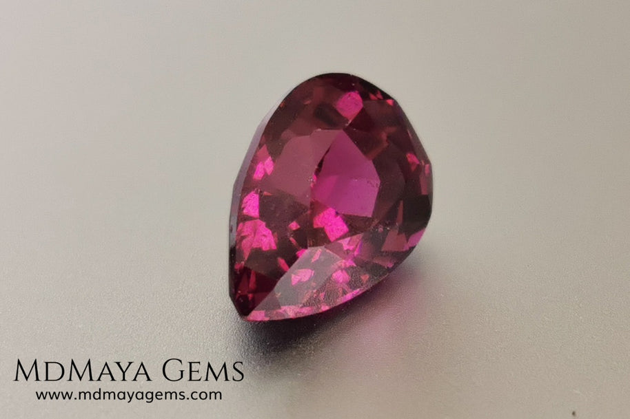 Stunning Umbalite garnet with vivid reddish purple hue and pear cut. Natural, untreated, and ideal for standout jewelry pieces.